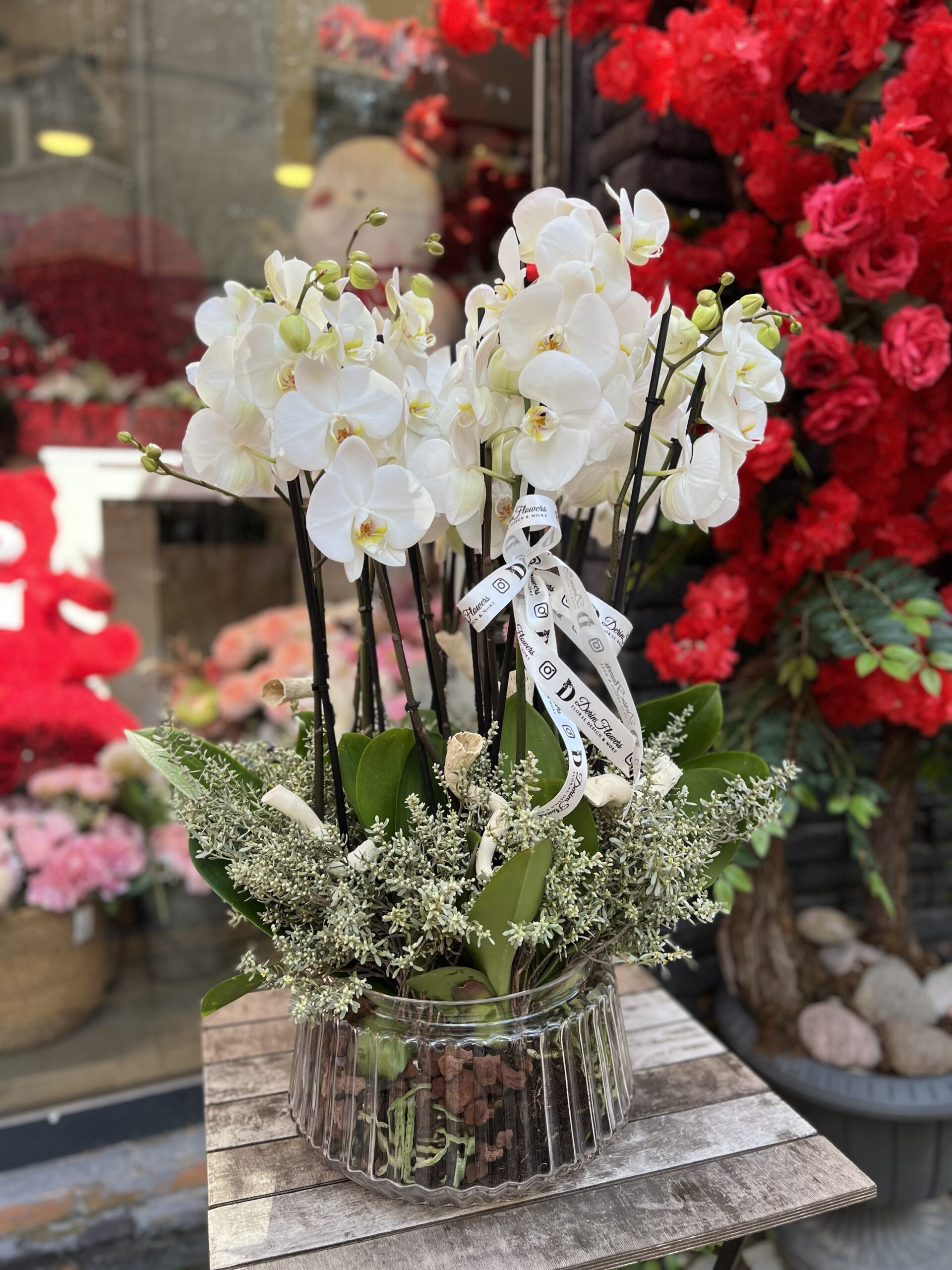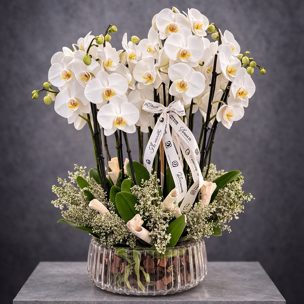 Bu aranjmanda kullanılan 10 dal beyaz orkide, dolgun ve hacimli yapısıyla ilk bakışta etkileyici bir görünüm sunar. Orkidelerin doğal formu korunarak yerleştirilmiş dallar, dengeli ve estetik bir kompozisyon oluşturur. Cam vazo içerisinde kullanılan doğal taşlar, yosun detayları ve yeşil dokular tasarımı tamamlayarak modern ve şık bir sunum sağlar.