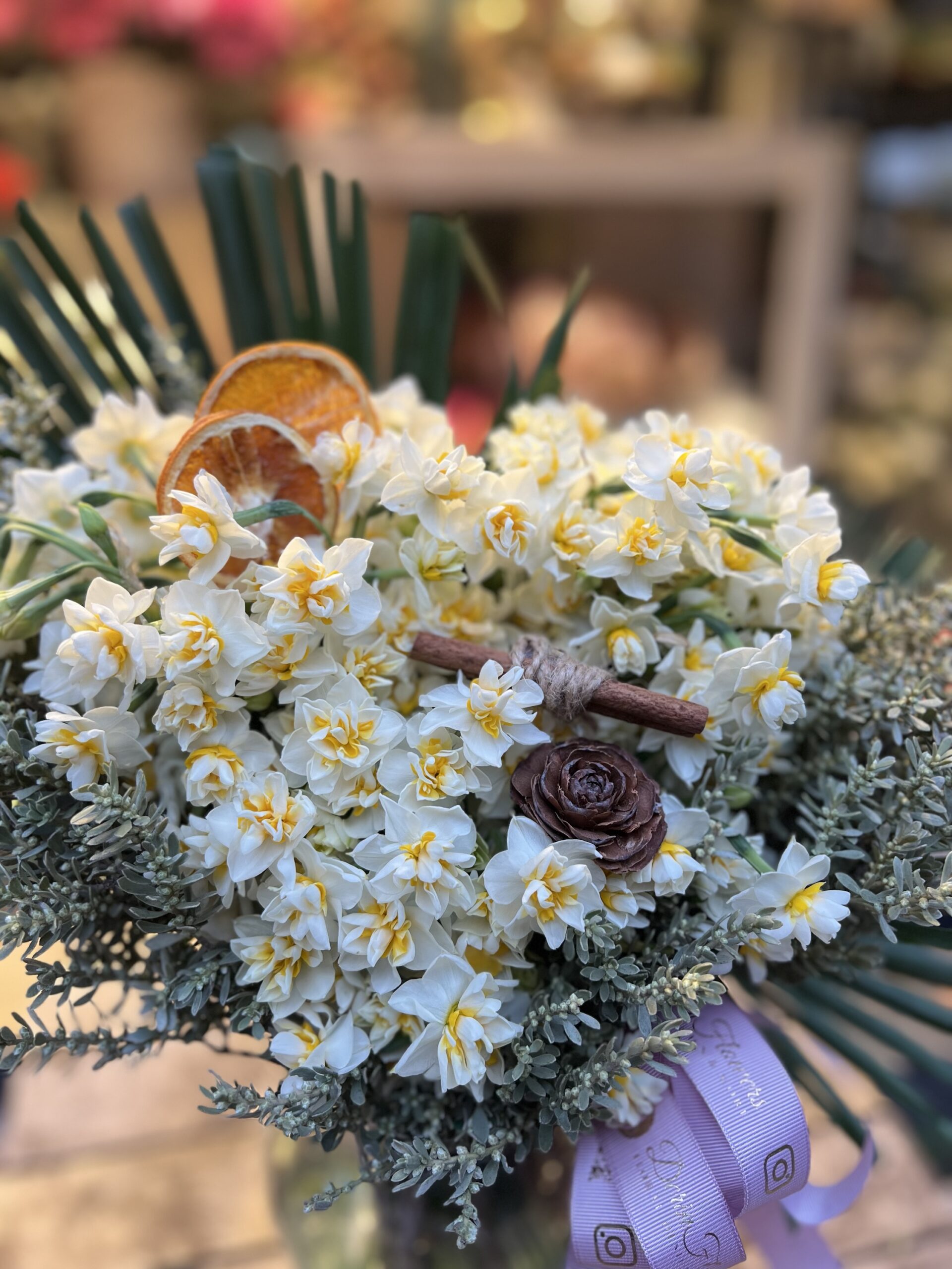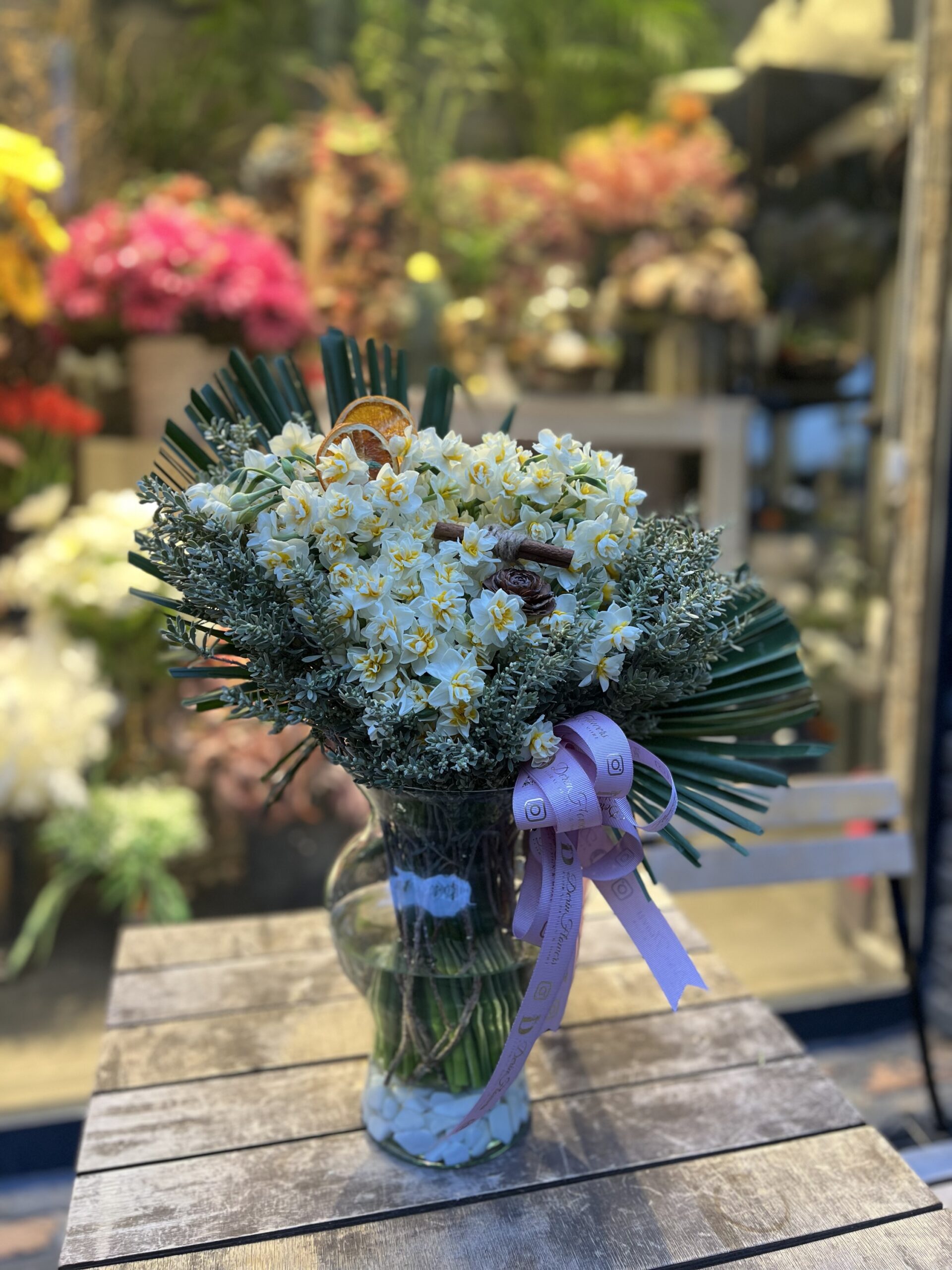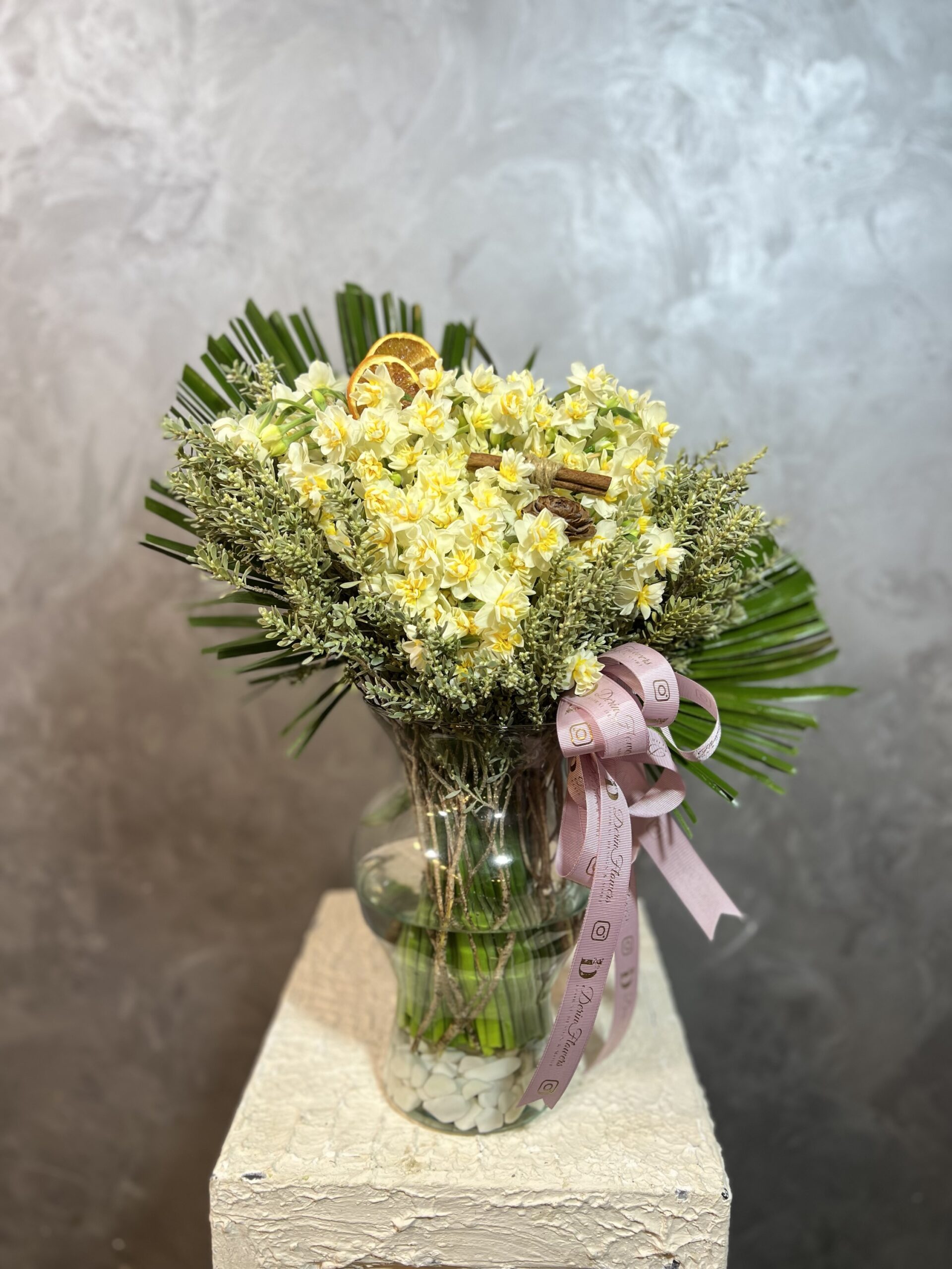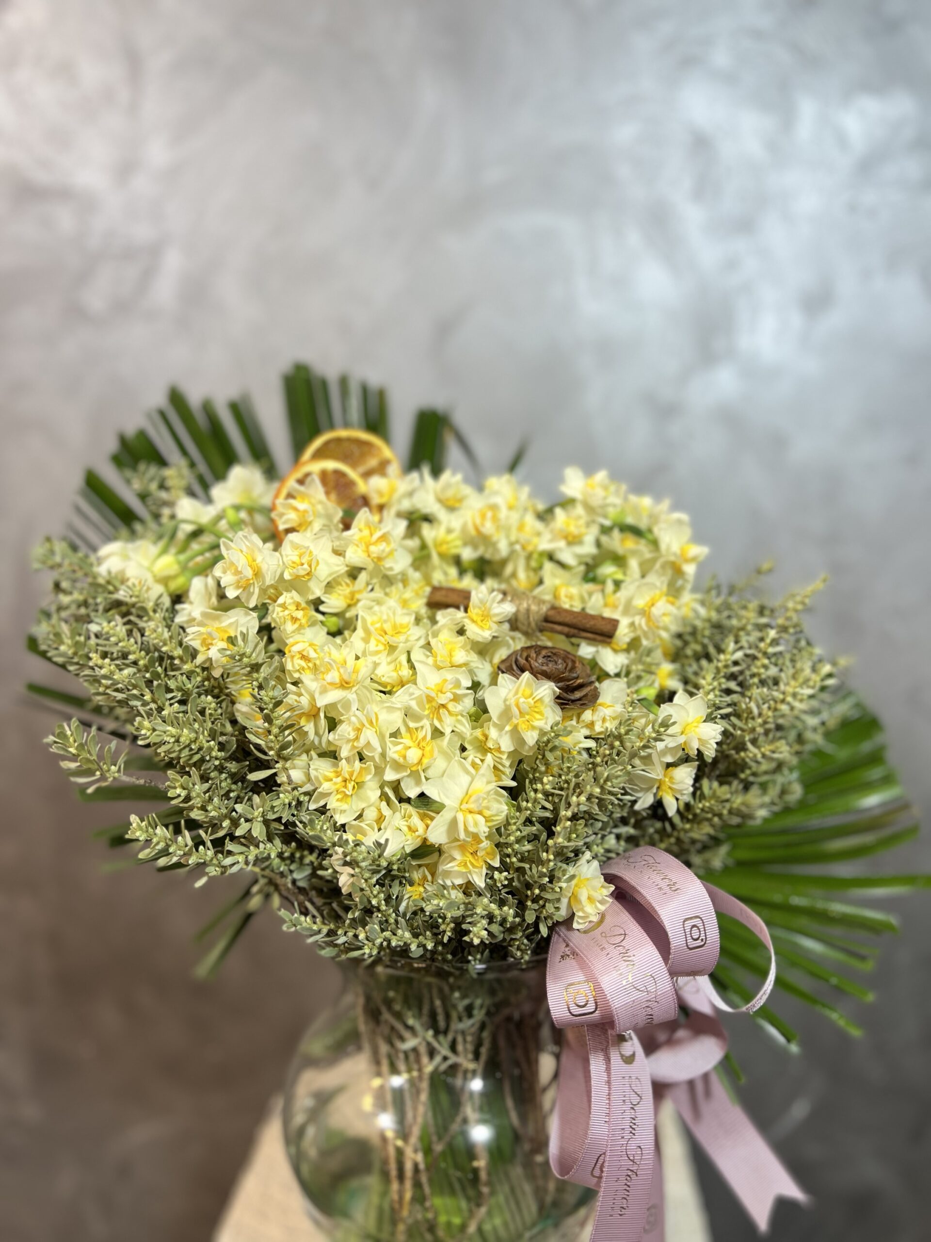Zarif cam vazo içerisinde 100 dal nergis ve dekoratif aksesuarlarla hazırlanan mis kokulu aranjman