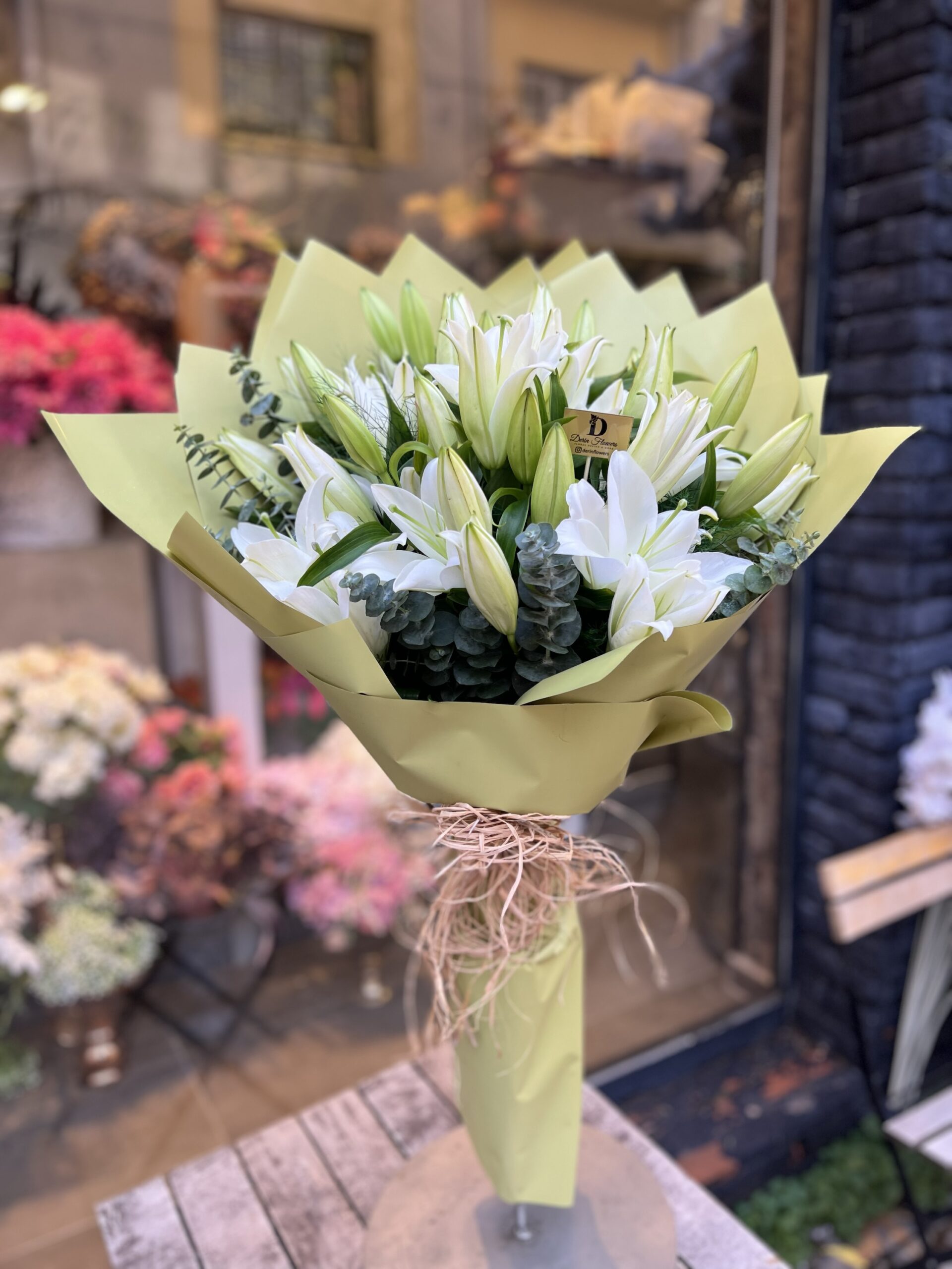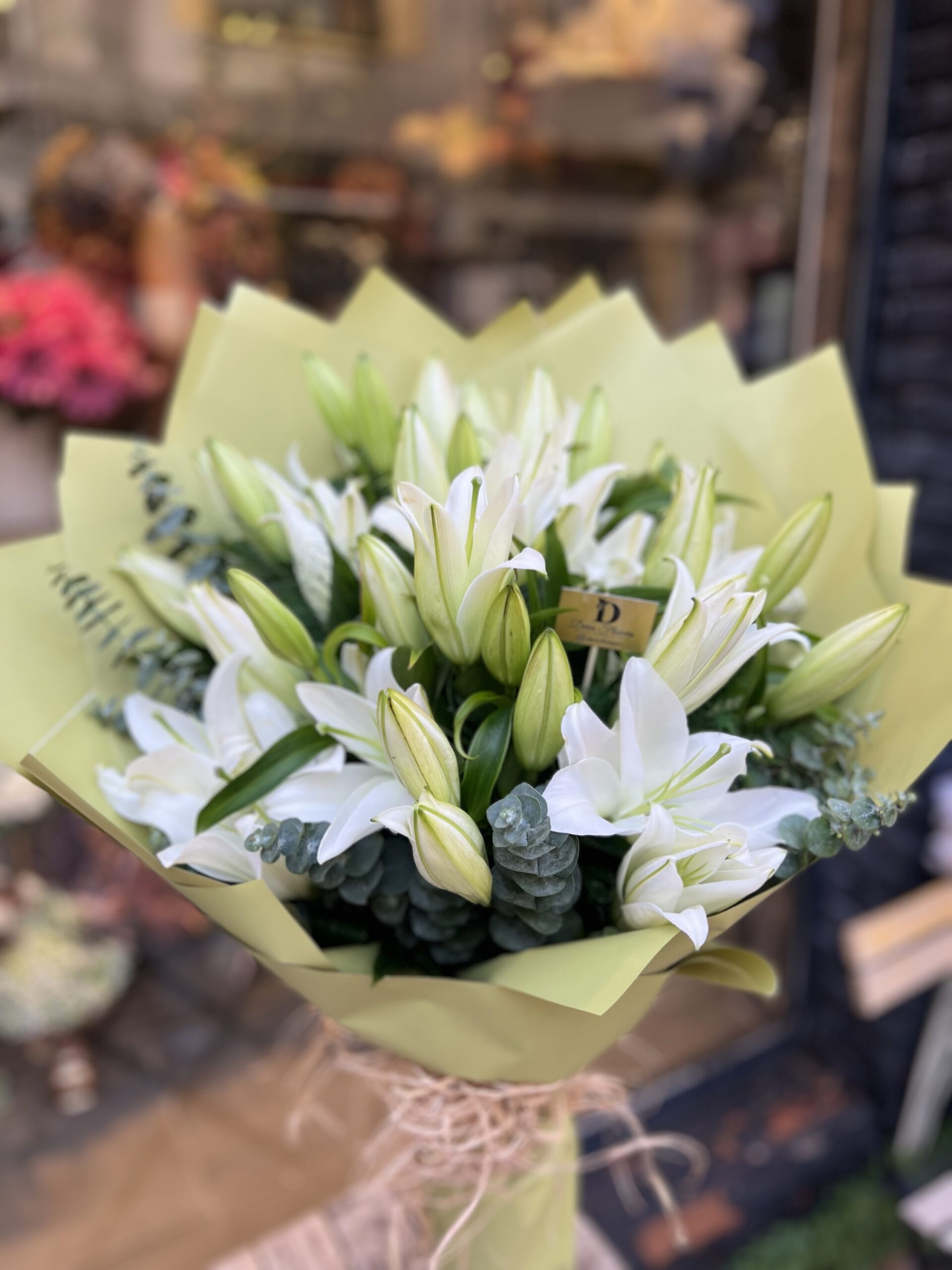 8 dal beyaz lilyum ile hazırlanan zamansız bir buket.