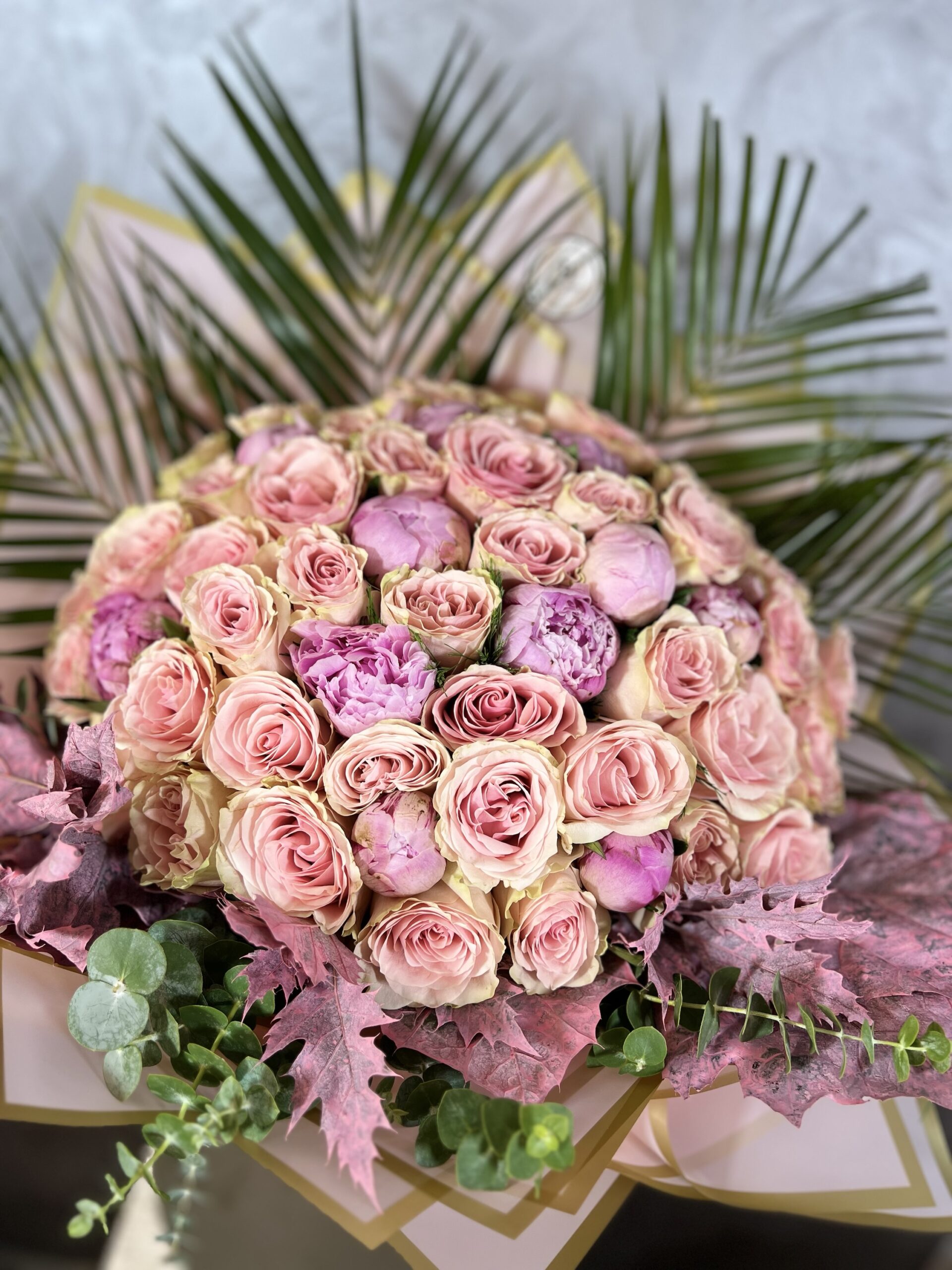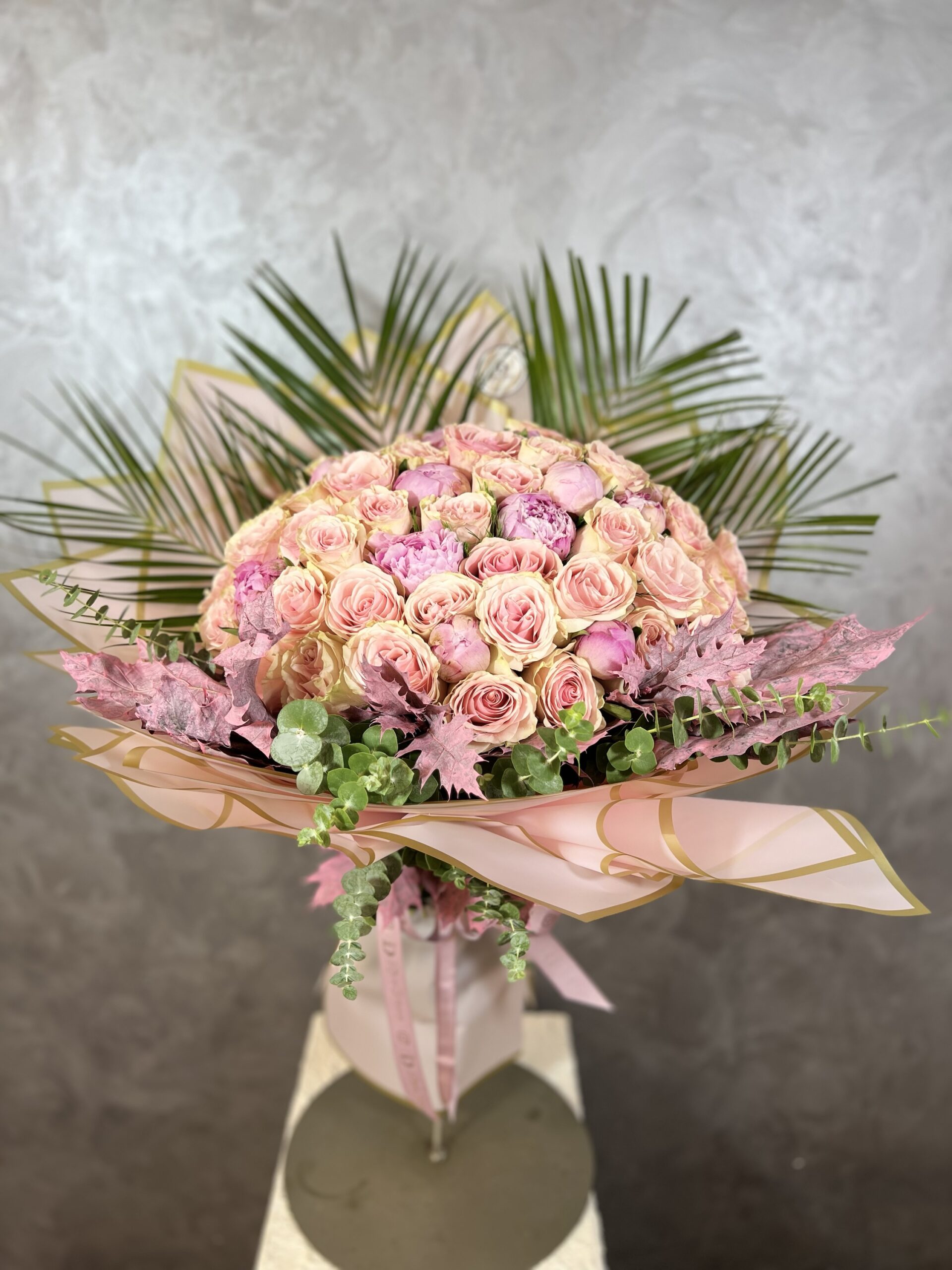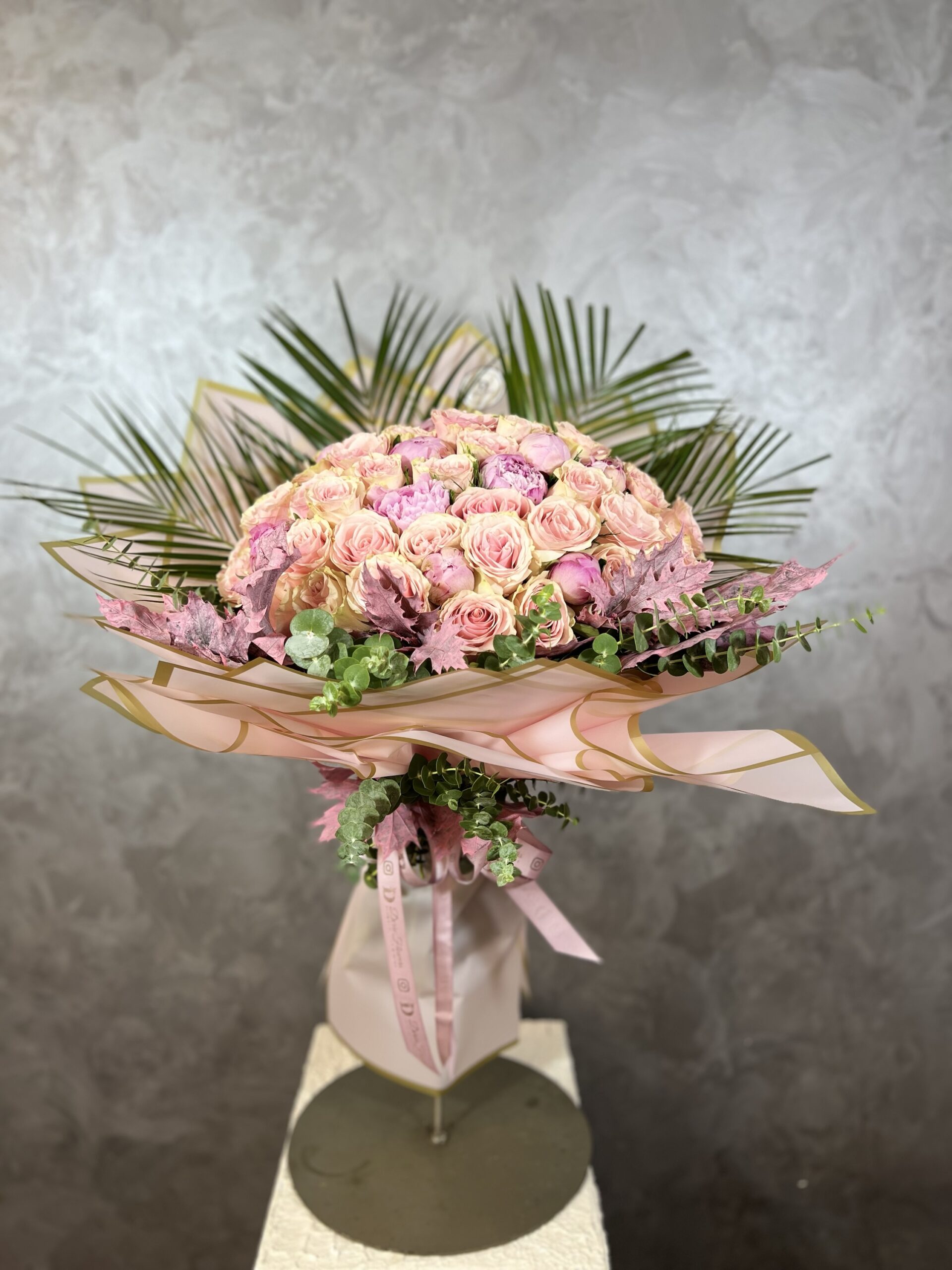 XL boy buketimizde 50 adet ithal gül, 10 adet şakayık ve çeşitli garnitürler kullanılmıştır.