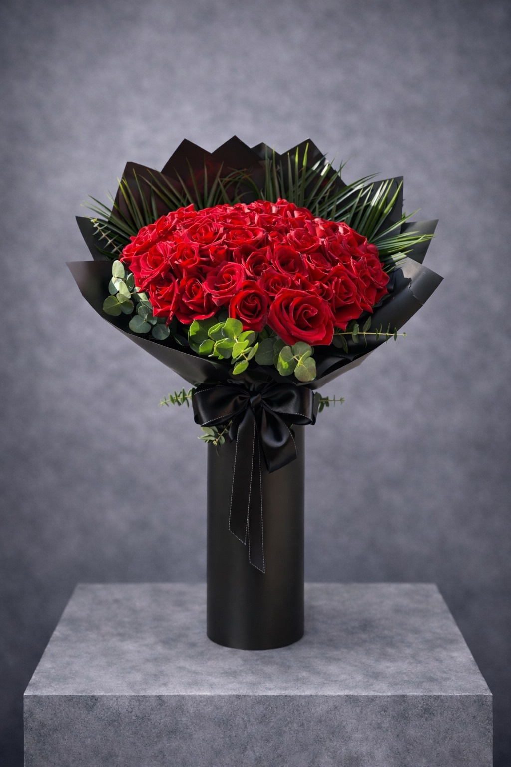 Bu tasarımda kullanılan siyah premium ambalaj, kırmızı güllerin rengini daha da ön plana çıkararak kontrast ve şıklık yaratır. Yeşil okaliptus detayları ise bukete doğal bir denge ve ferahlık katar. Modern ve sofistike bir görünüm sunan bu kombinasyon, ürünü klasik buketlerden ayırarak daha üst segment bir konuma taşır.