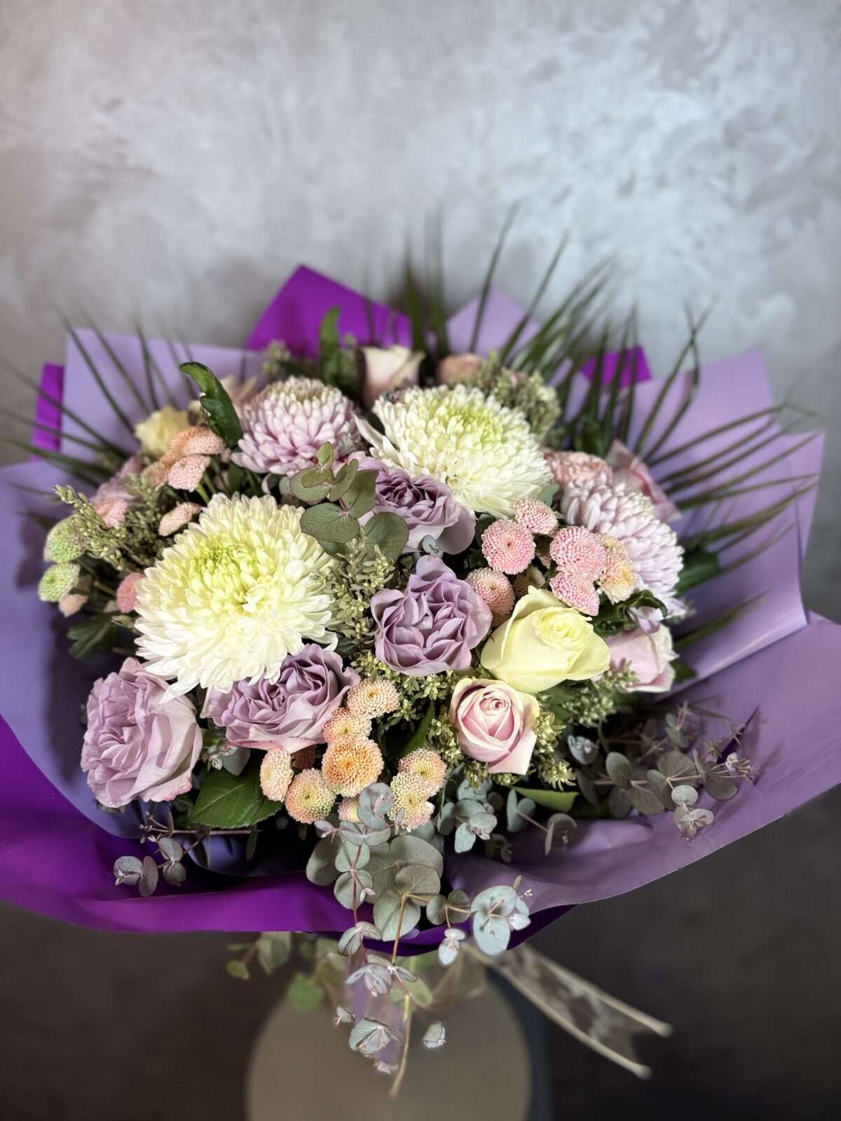 Mor anastasia, pastel güller ve krizantemlerle hazırlanmış zarif el buketi.