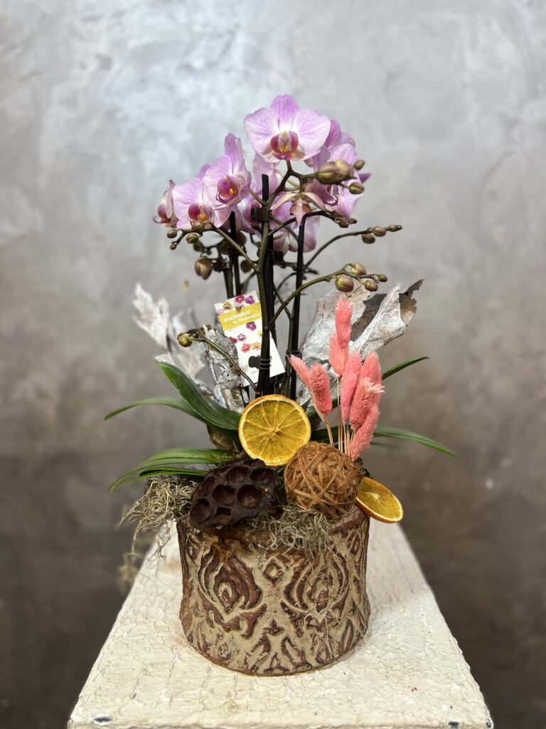 Double Midi Orchid, göz alıcı iki dal mini orkidenin şık bir şekilde bir araya getirildiği zarif bir tasarımdır. Bu mini orkideler, zarafetleri ve tazelikleriyle her mekana ferahlık katarken, modern bir estetik sunar. Minimalist bir dokunuş arayanlar için ideal olan bu aranjman, ofis masalarından oturma odalarına kadar her alanda göz alıcı bir detay olarak öne çıkar. Sevdiklerinize anlam dolu bir hediye sunmak, özel anlarınızı kutlamak ya da sadece kendinizi şımartmak için mükemmel bir alternatif olan Double Midi Orchid, her bakışta mutluluk ve huzur aşılar. Evinize veya sevdiklerinize renk katmak için bu şirin mini orkide tasarımını tercih edin.