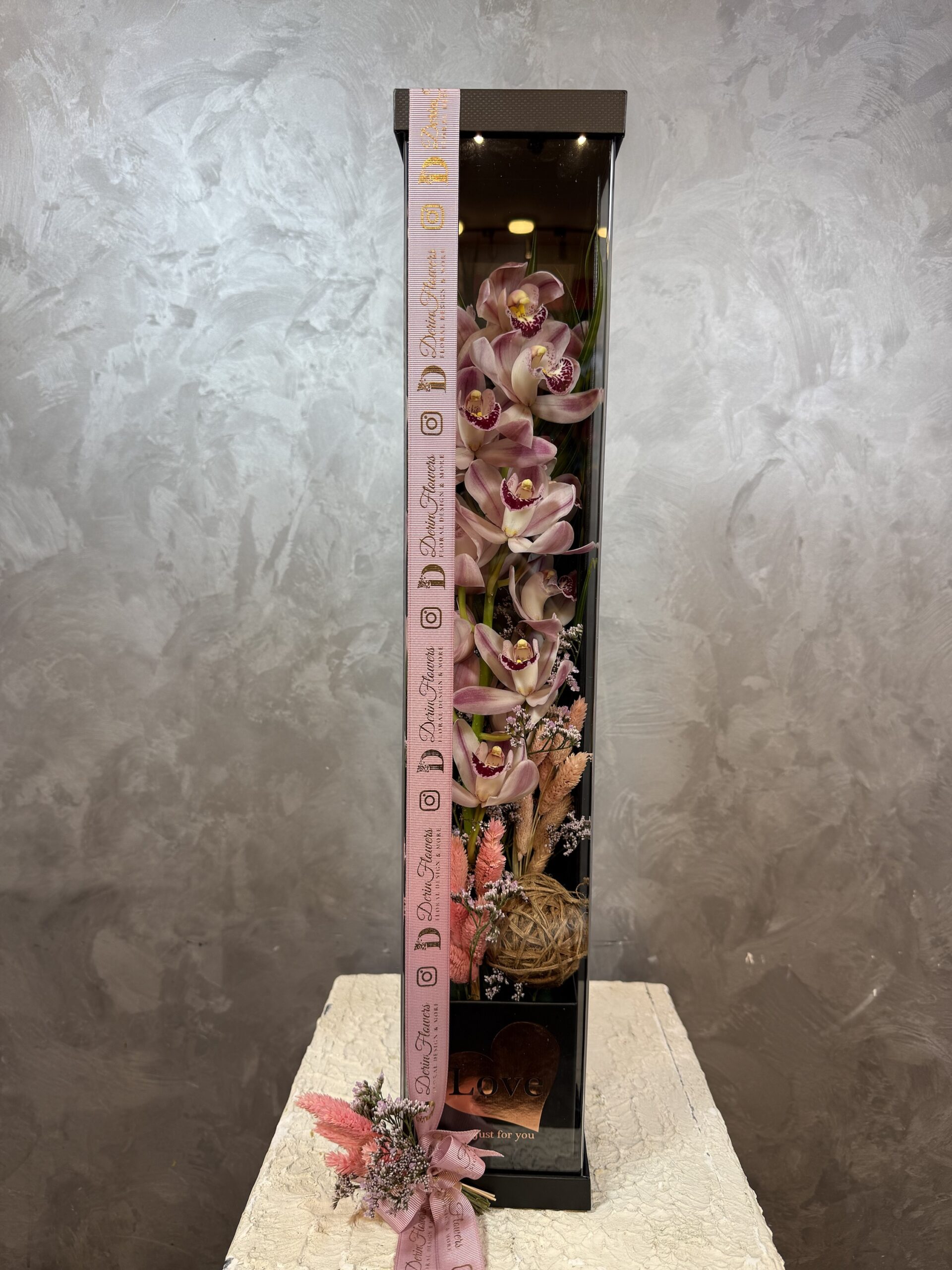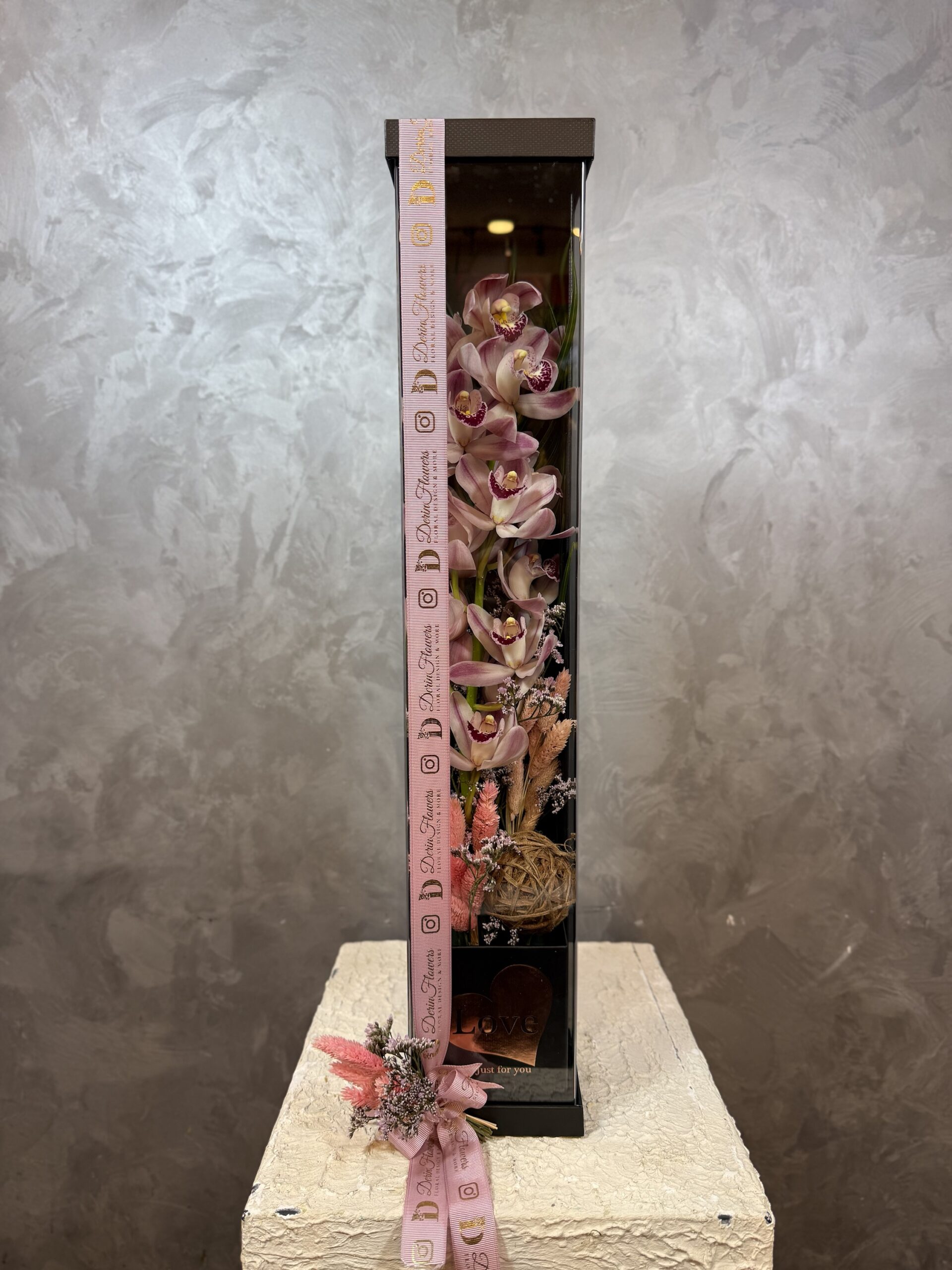 Love Box Orkide, şıklığı ve zarafeti tek bir tasarımda buluşturur. Özel şeffaf kutusu içerisinde sunulan orkide çiçekleri, dekoratif kuru çiçek dokunuşları ve romantik detaylarla hazırlanmıştır.