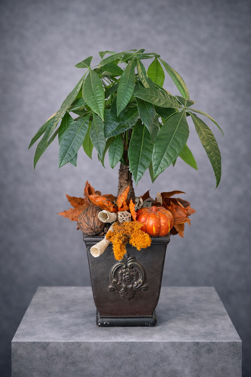 Şans ve bereketin simgesi Pachira Aquatica (Para Ağacı); özel tasarım saksı ve doğal dekorlarla hazırlanmış, uzun ömürlü ve anlamlı bir canlı bitki aranjmanıdır.