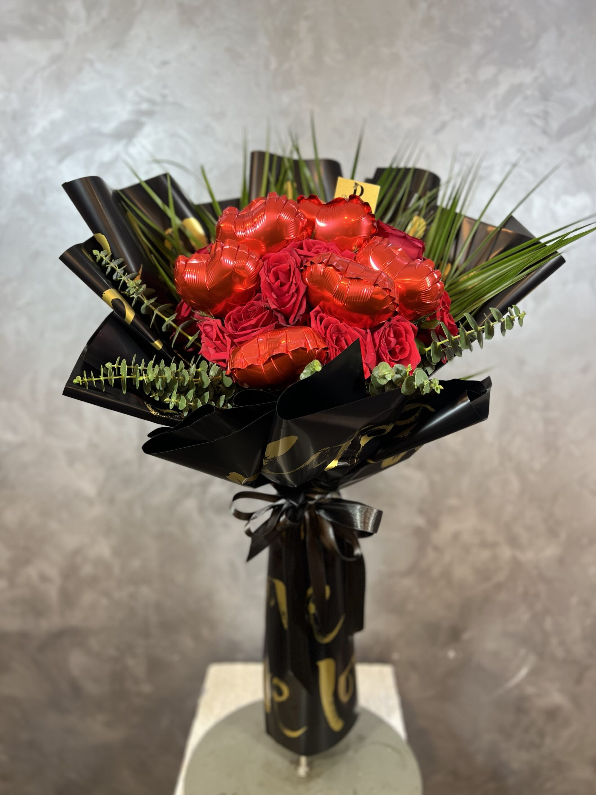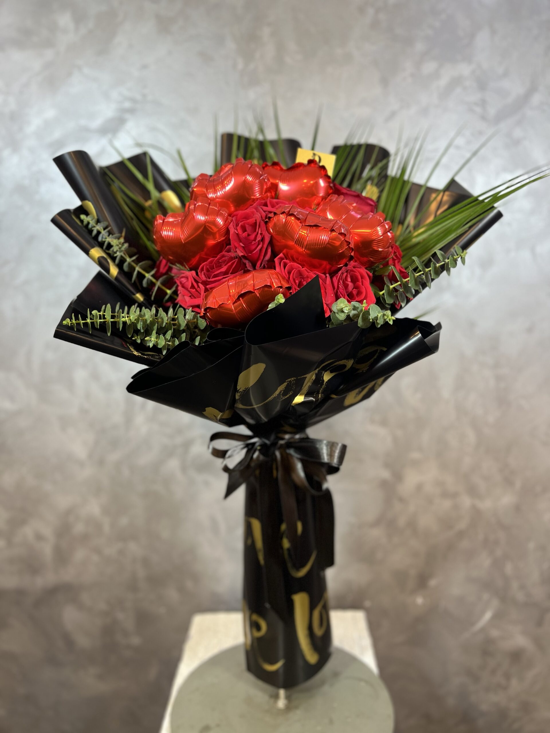 Buket içerisinde bulunan 11 adet canlı kırmızı gül, sevginin en romantik sembolüdür. Aranjmana eşlik eden 6 adet parlak kalp folyo balon ise sürprizi daha eğlenceli ve dikkat çekici hale getirir. Siyah premium ambalaj ve şık kurdele detayı sayesinde hem modern hem de lüks bir görünüm sunar.