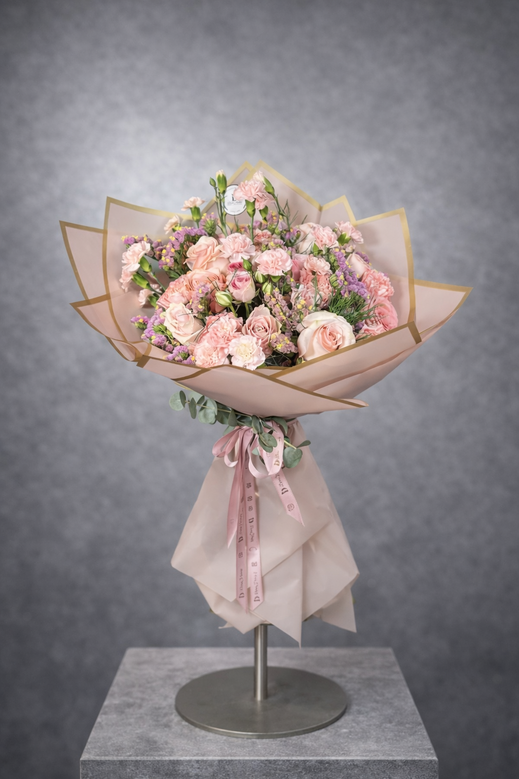 Zarif pudra tonlarıyla hazırlanan bu özel buket; gül, lisyantus ve karanfillerin yumuşak dokunuşuyla sevdiklerinize duygusal ve şık bir jest sunar. Aşkı, zarafeti ve inceliği bir araya getiren mükemmel bir hediye.