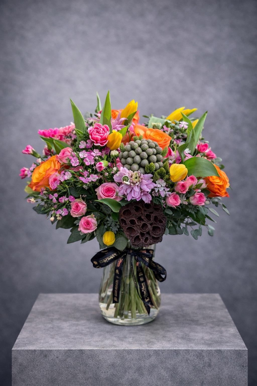 Renklerin uyumunu ve doğanın enerjisini bir araya getiren bu özel vazoda çiçek aranjmanı, sevdiklerinize unutulmaz bir sürpriz yapmak isteyenler için özenle tasarlandı. Derin Flowers’ın imza dokunuşuyla hazırlanan bu aranjman; pembe güller, turuncu tonlarında çiçekler, sarı laleler ve mevsim çiçekleriyle zenginleştirilerek hem göz alıcı hem de duygusal bir etki yaratır.