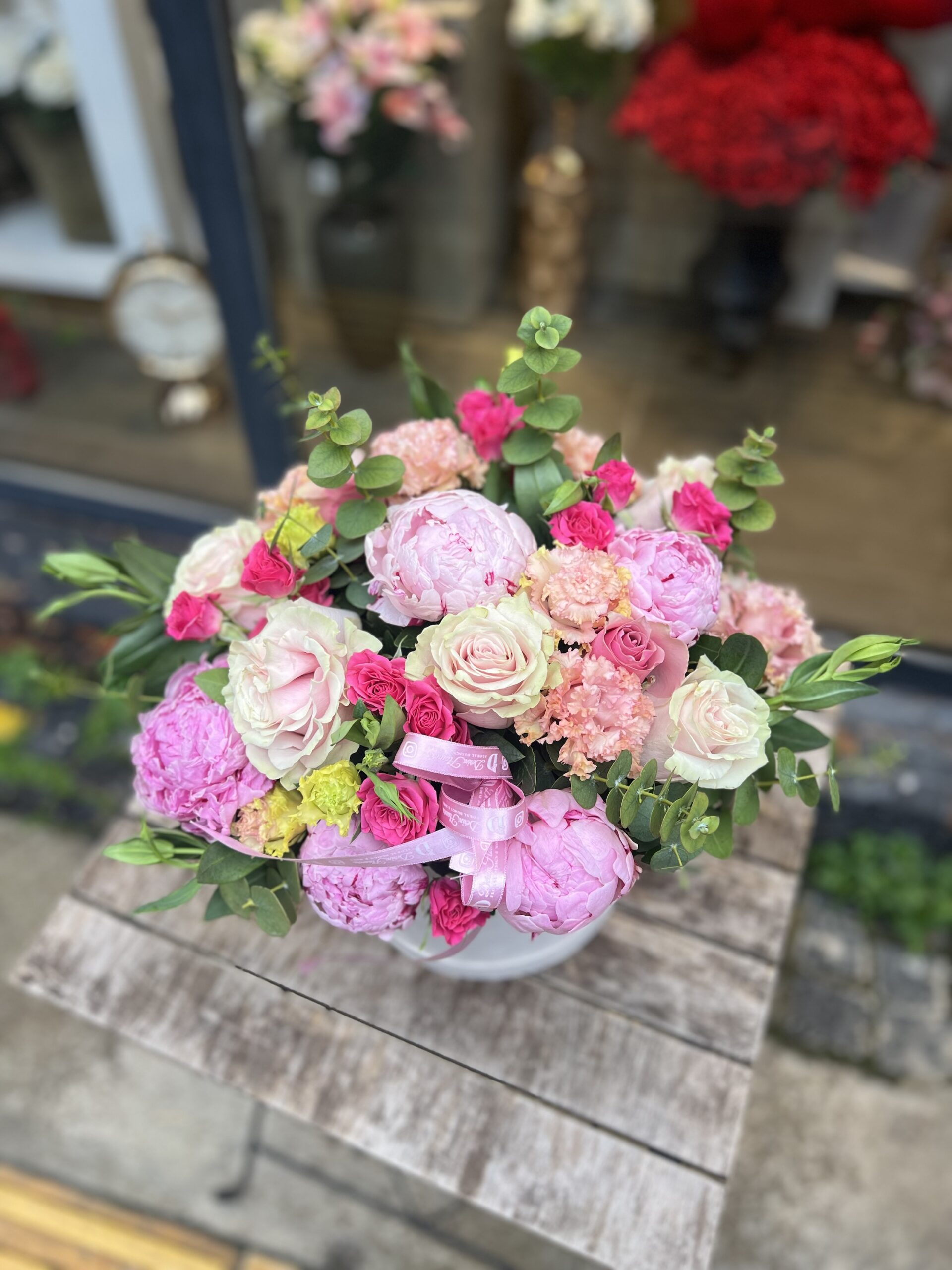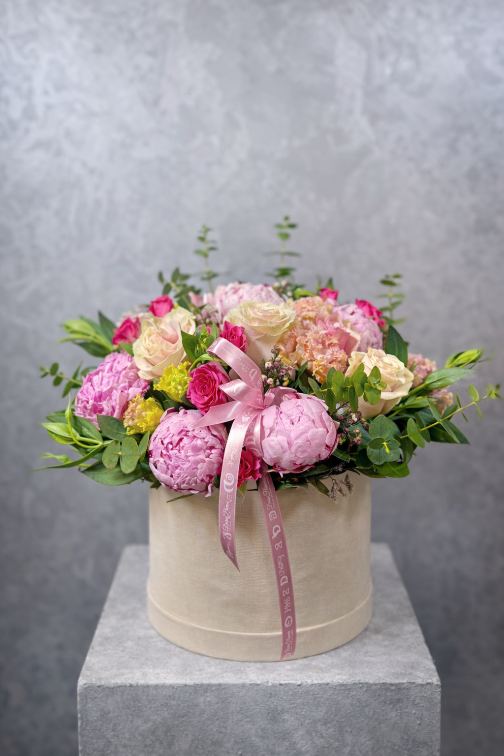 Premium pembe şakayıklar, krem ithal güller, canlı fuşya gül detayları ve doğal okaliptus dokunuşları ile tasarlanan bu özel aranjman; şık silindir kutu içerisinde modern ve dengeli bir kompozisyon sunar.