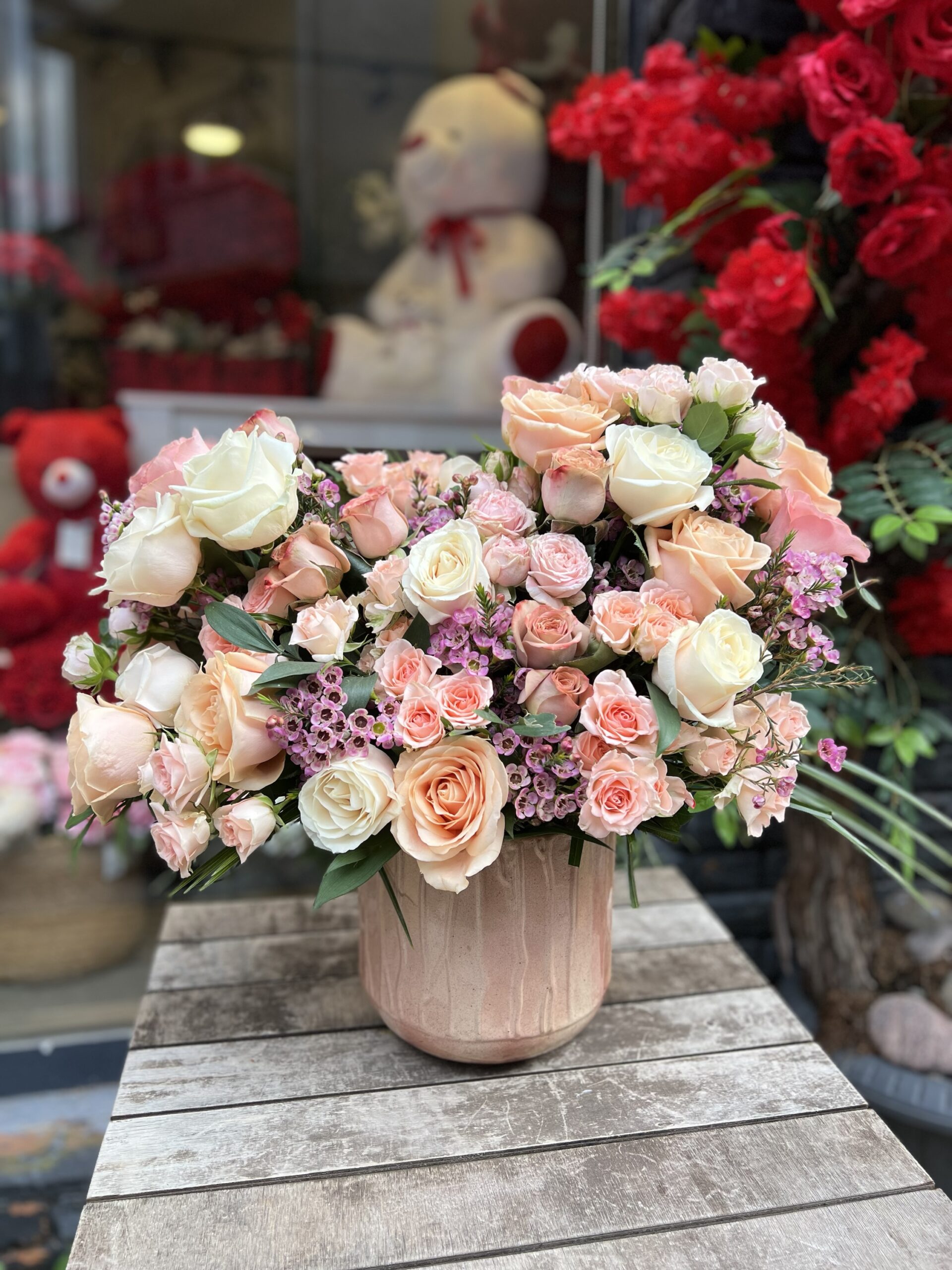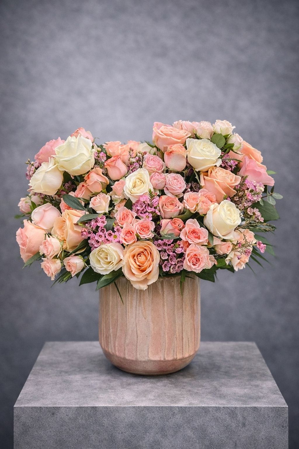 Zarafetin en sade ve en etkileyici haliyle buluştuğu bu özel seramik vazoda çiçek aranjmanı, pastel tonların uyumunu sevenler için tasarlanmış premium bir üründür. Somon güller, krem güller ve minik pembe detay çiçeklerle zenginleştirilen bu tasarım, hem romantik hem de modern bir görünüm sunar.