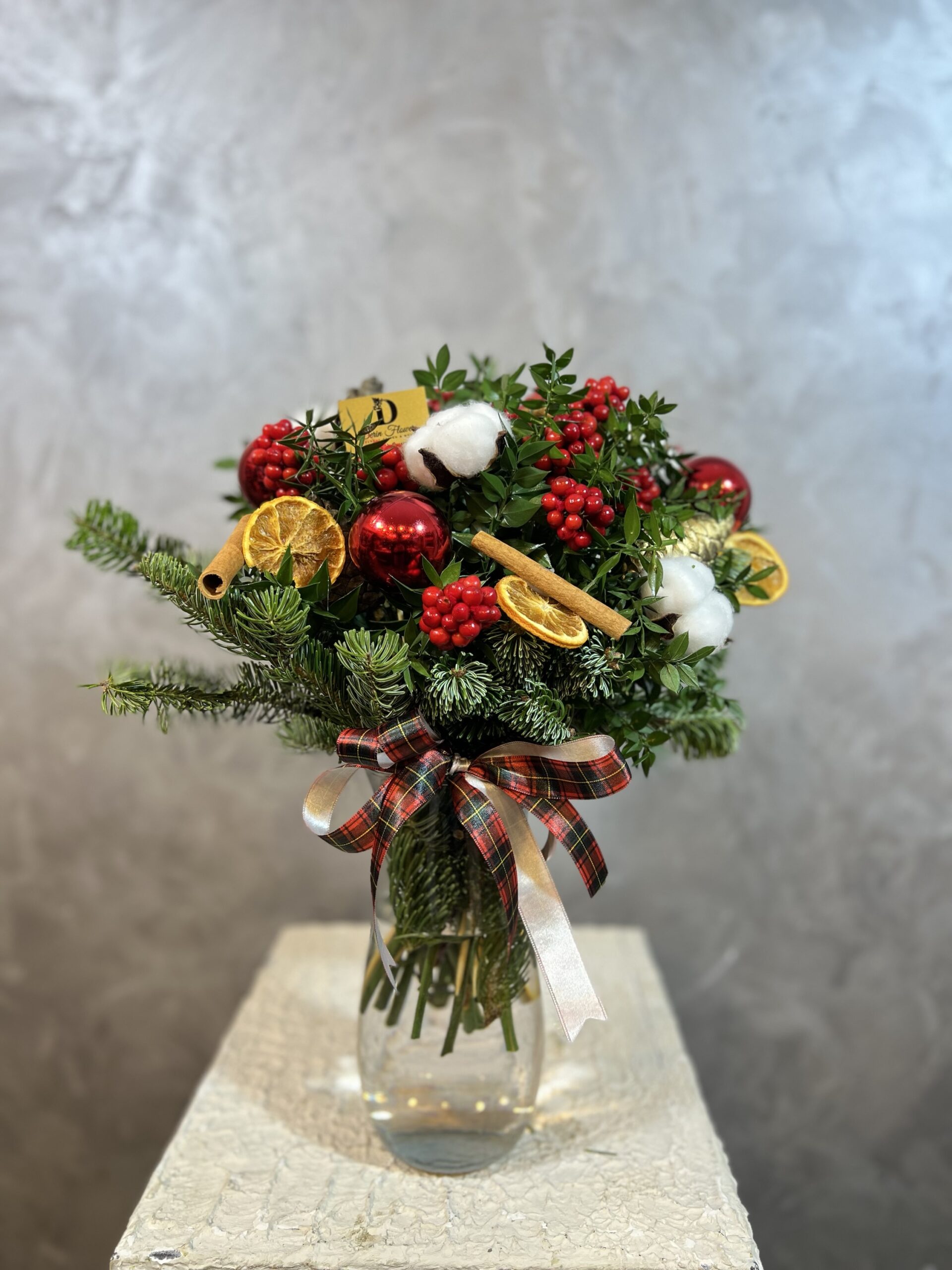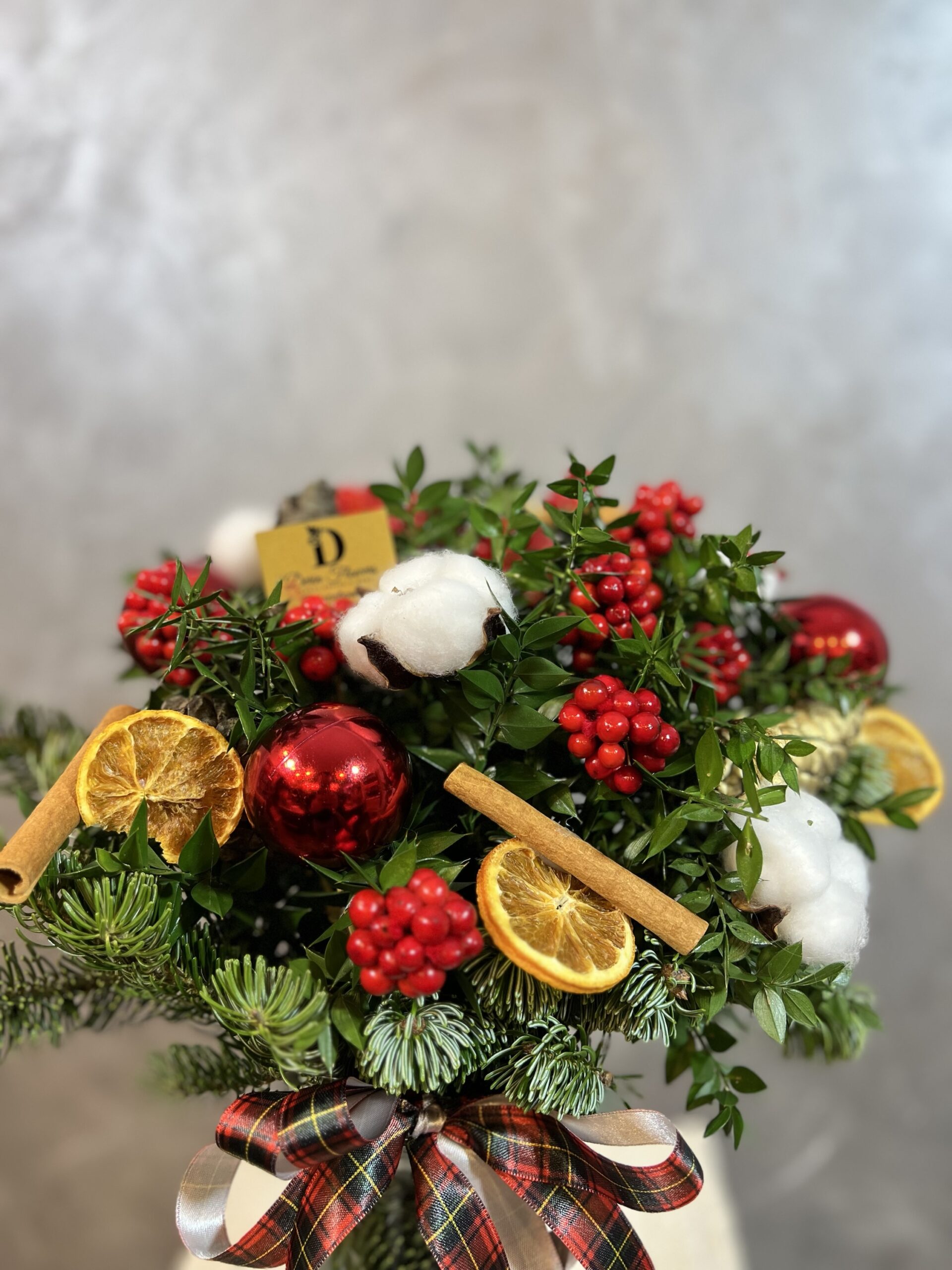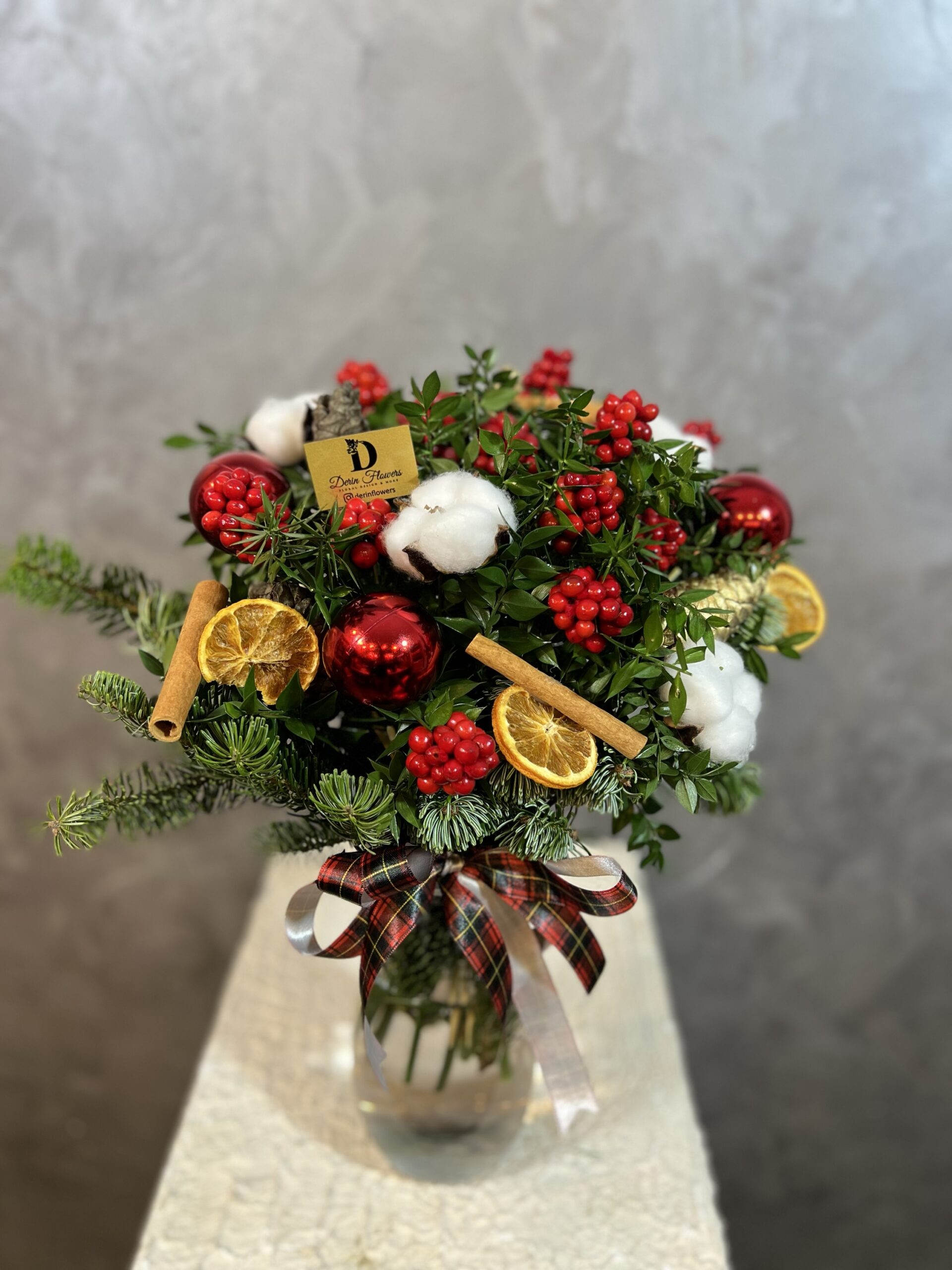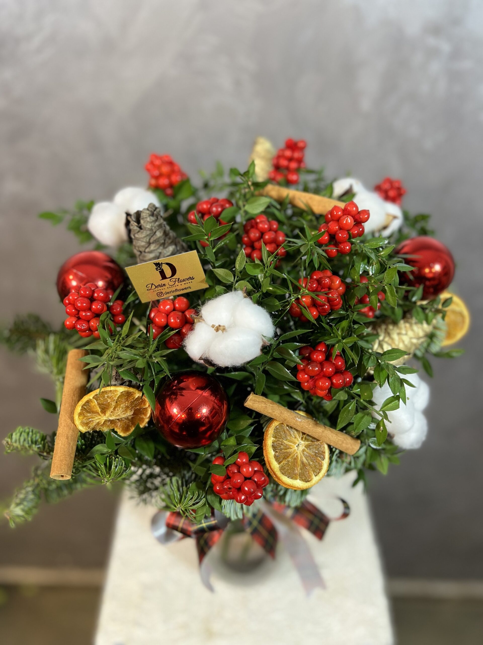 Doğal formunun korunması sayesinde aranjman uzun süre tazeliğini korur ve yılbaşı atmosferini evinizde ya da ofisinizde hissettirir. Hem klasik dekorasyonlarla hem de modern çizgilerle uyum sağlayan bu özel tasarım; sevdiklerine anlamlı, sezonun ruhunu taşıyan bir hediye vermek isteyenler için de mükemmel bir tercihtir.