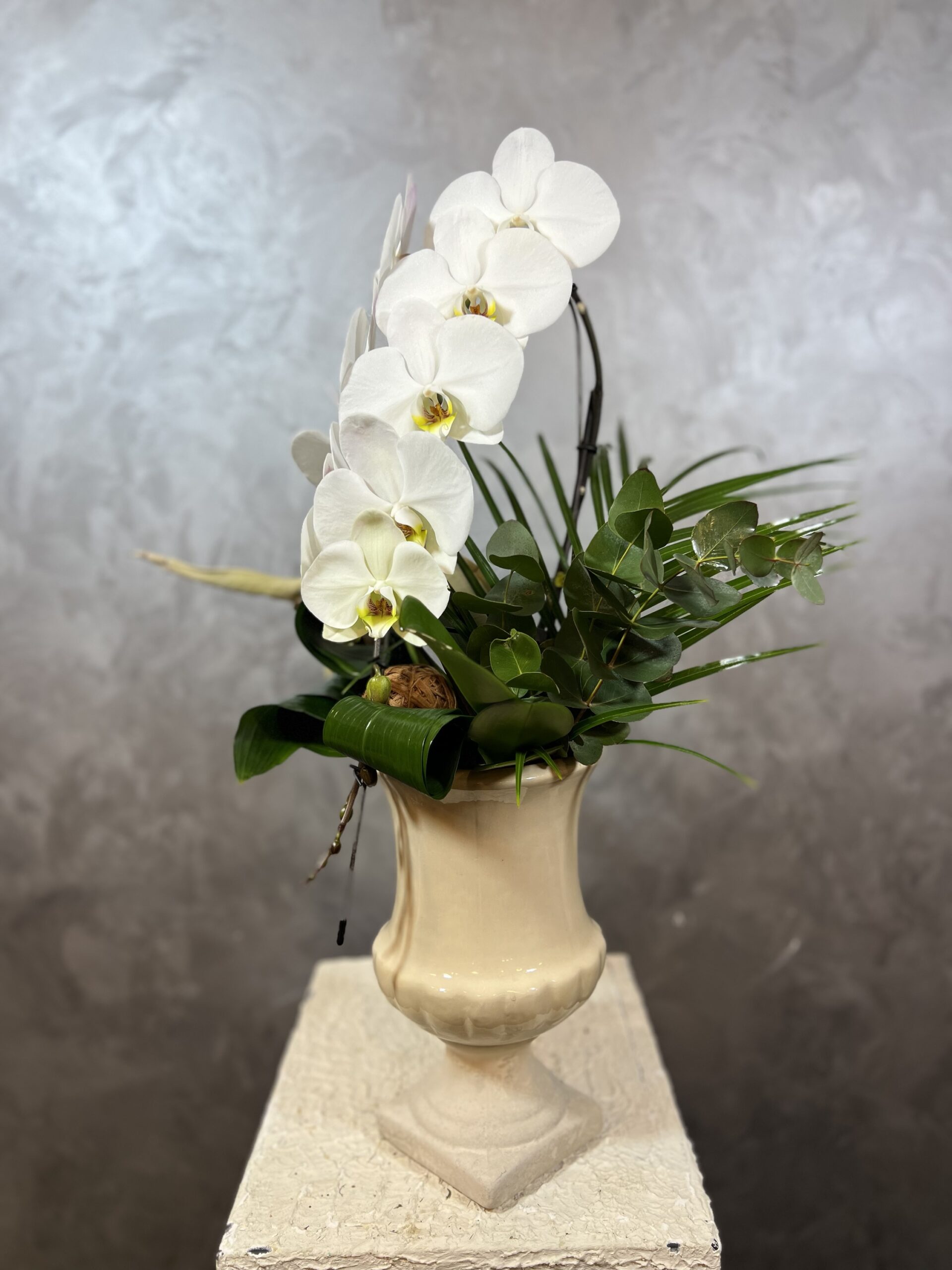 Dayanıklı yapısı sayesinde uzun süre formunu koruyan Phalaenopsis orkide, bakımı kolay ve bulunduğu ortama ferahlık katan bir bitkidir. Seramik vazo ile birlikte sunulan bu şelale orkide, yaşam alanlarında dekoratif bir odak noktası oluşturur.